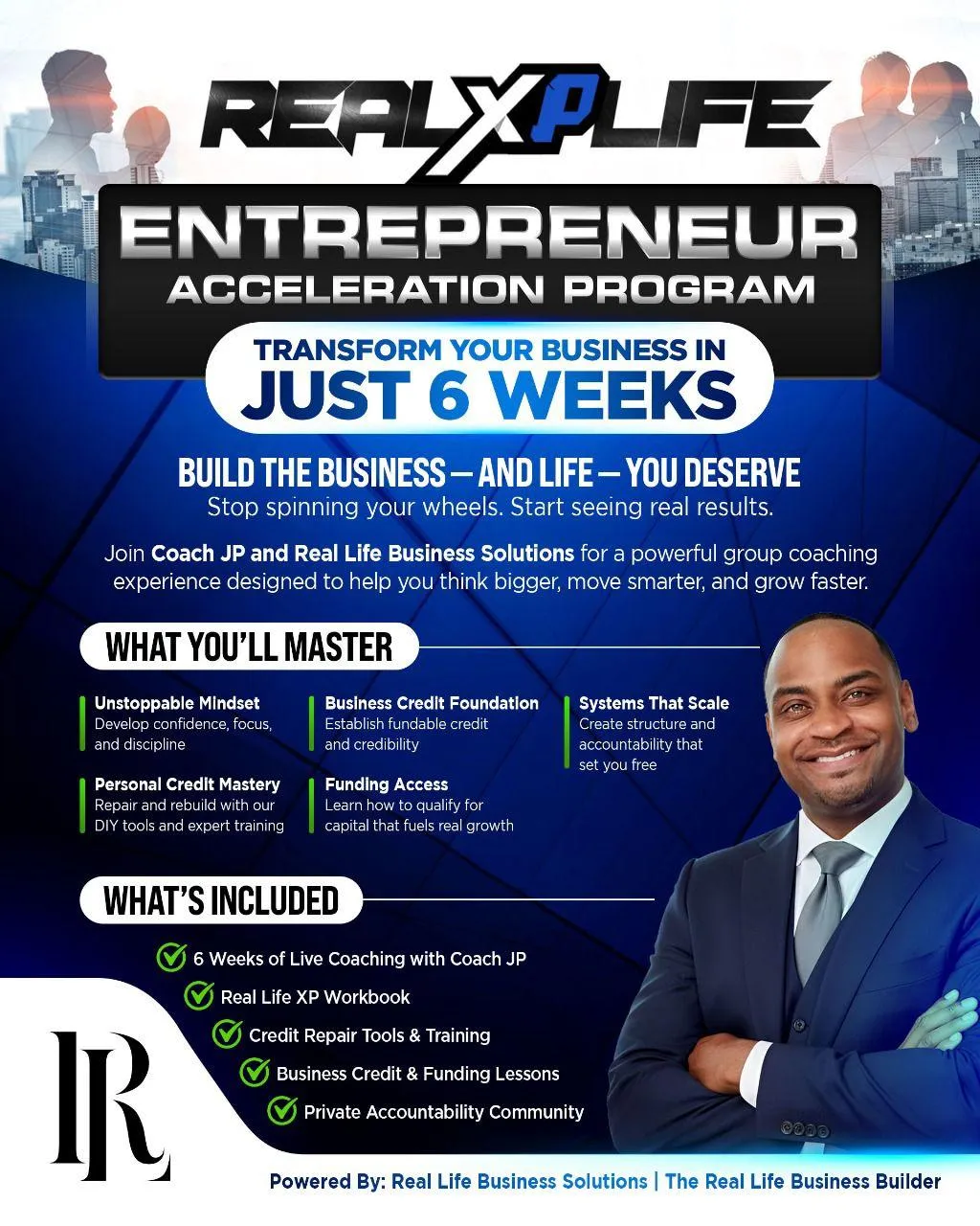 Through his company, Real Life Business Solutions, and his signature framework, the Real Life XP: Entrepreneur Acceleration Program, Coach JP has guided hundreds of entrepreneurs in breaking through income plateaus, mastering business credit and funding, and implementing systems that allow their businesses to thrive without burning them out.